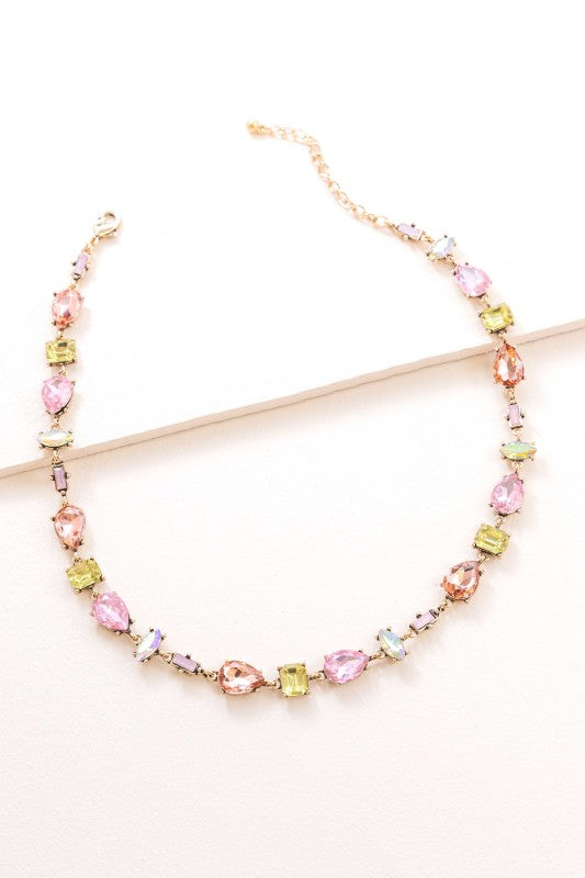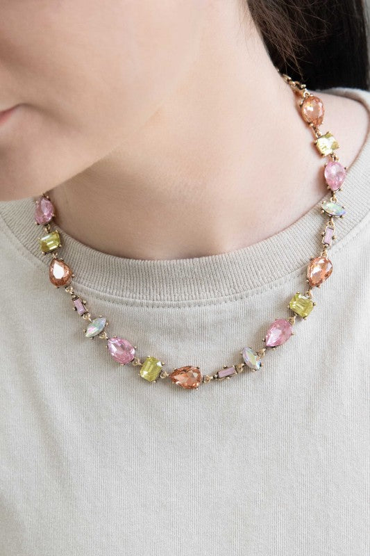 The Rosalie Gemstone Necklace features tear drop, square, and oval shaped crystal stones with a pink iridescent flare!♡ Gold chain with lobster clasp♡ Plated Metal (lead and nickel free)♡ Measurements: Length: 19" / 48 cm