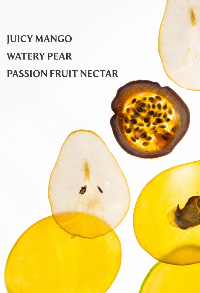 Mango Passion Scent: Luscious and energizing. Juicy mango and passion fruit nectar blend with watery pear, radiating the sweetness of sun-soaked days.