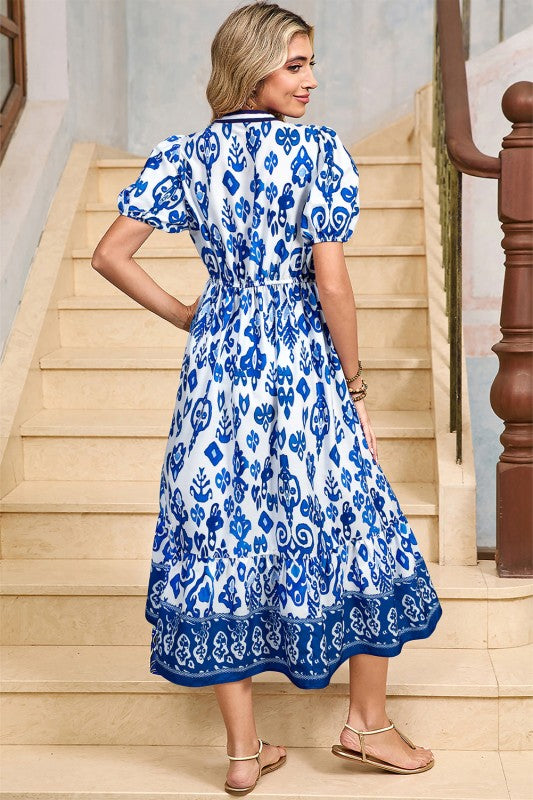 Step into season with this playful maxi dress! The fabric blooms with charming prints complemented by fun striped details at the neckline. Its notched neck design and short puff sleeves add a flirty touch, while side slit pockets keep it practical. Crafted from soft, lightweight fabric, this high-waist dress moves with you comfortably and flatters your silhouette perfectly. 100% Polyester