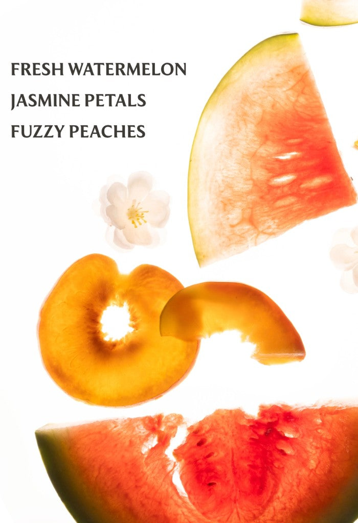 Wild Watermelon Scent: Juicy and playful. Wild watermelon mingles with jasmine petals and the soft sweetness of fuzzy peaches, evoking a carefree summer breeze and sunlit joy.
