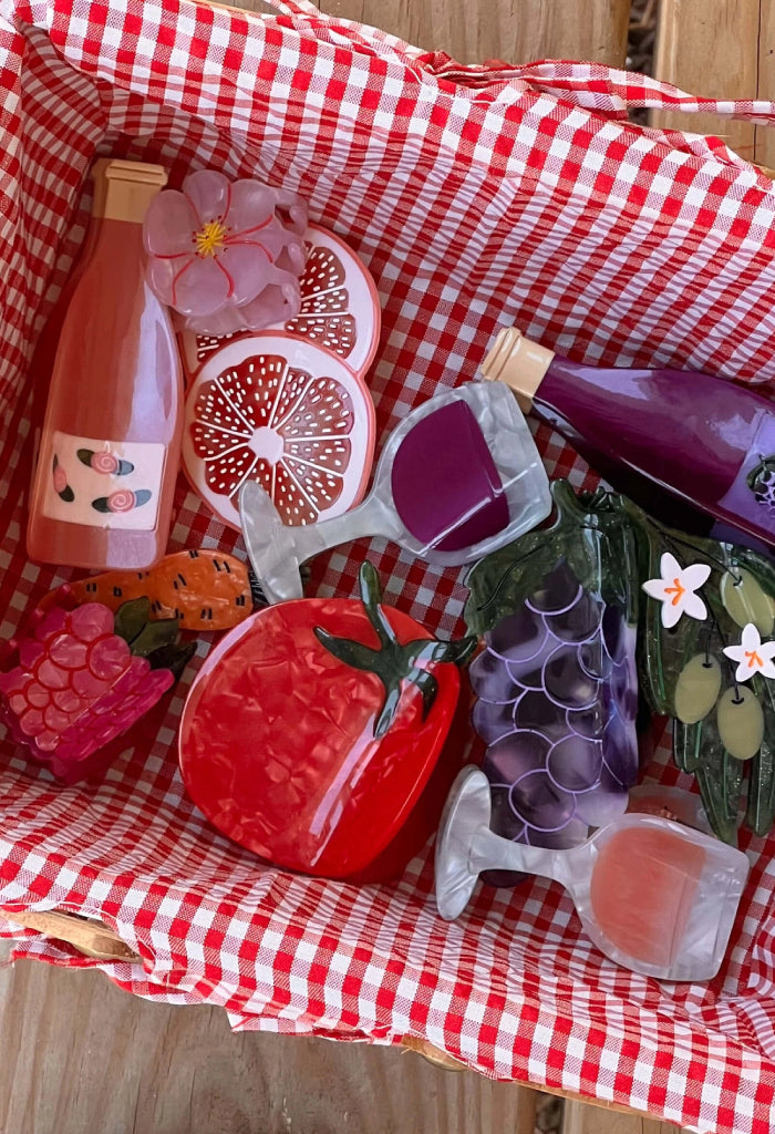 Rosé all day? Yes, please. This rosé wine glass hair claw is a food-themed, eco-friendly hair accessory made from cellulose acetate. At 3" x 1.5", this handmade pink beauty adds a sparkling twist to your ‘do. Perfect for wine lovers, brunch besties, and anyone obsessed with cute rosé hair clips that say, “cheers” to fun style.