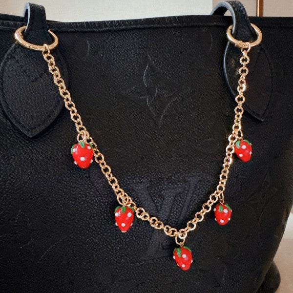 These adorable glass strawberry charms paired with golden hardware bring a playful yet luxurious vibe to your everyday style. Whether clipped to your tote or handbag, this charming accessory adds a fun and eye-catching touch to your look.
