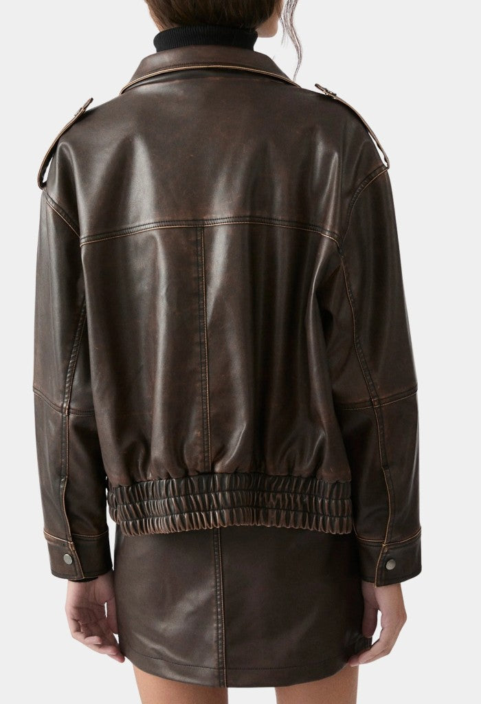 • Exude effortless cool in the Thomas Jacket. A comfy relaxed fit and a chic distressed design makes this faux leather bomber jacket perfect to wear from day to night. Layer it over your favorite graphic tees with jeans, dresses or pair it with the Thomas Skirt for the ultimate matching set.