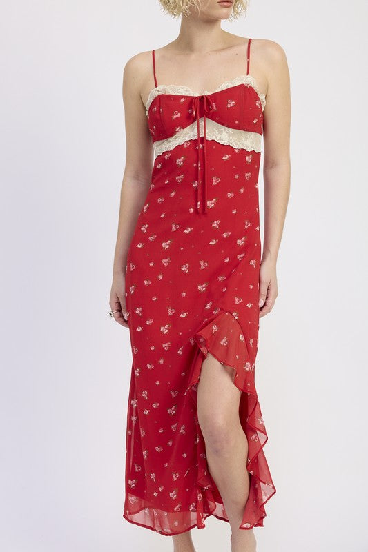 Beautiful chiffon midi dress featuring a front slit and and flattering lace bust with tie front and adjustable spaghetti straps. The cherry red color way and all over ditsy floral print create a vintage feel.