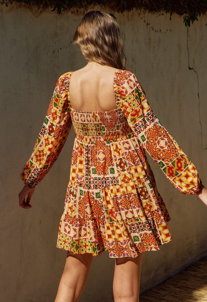 Channel your bohemian side in our Bonnie Dress. This adorable babydoll dress features a smocked bodice with a sweet mosaic print and tiered skirt. Style with a chic hat and tall boots just in time for fall festival season!
