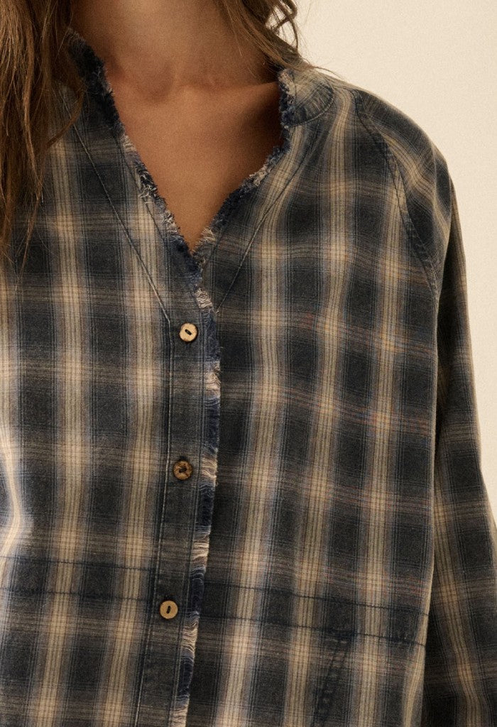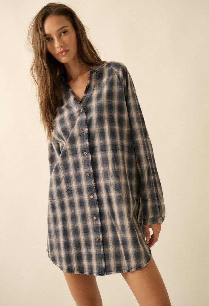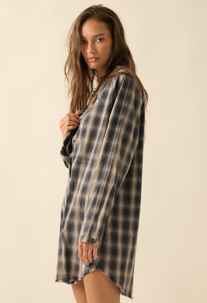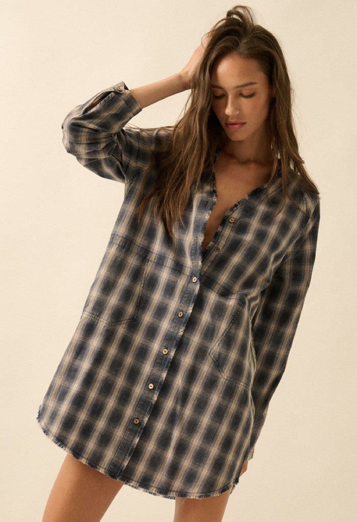 • Aren't you glad for plaid? Retro yet timeless, this cozy shirt dress features frayed detail with long sleeves and side pockets. Throw it on with leggings and fuzzy socks for a relaxing day at home or pair with tall boots and a cute pom pom hat while out-and-about.