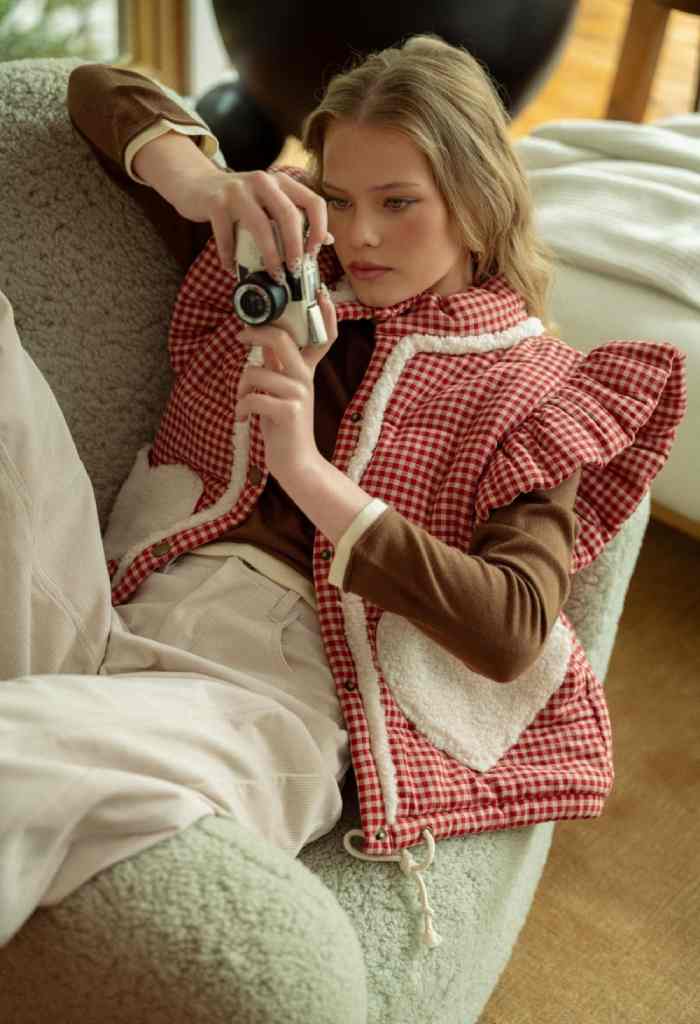Perfect for those chilly days, you'll love reaching for our Holly Vest. This sweet vest features a classic gingham pattern with adorable heart shaped pockets and playful ruffled shoulders. Layer it over your long sleeve tops or pullover sweaters when you're on the go!