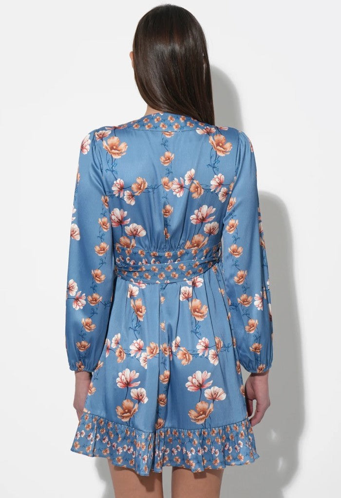 Dazzle in our darling Jody Mini Dress. A timeless wrap design accentuates your curves while a charming floral print and beautiful blue hue adds a playful touch. Perfect for a date, girls night out or wedding - complete your look with your favorite gems and strappy heels.