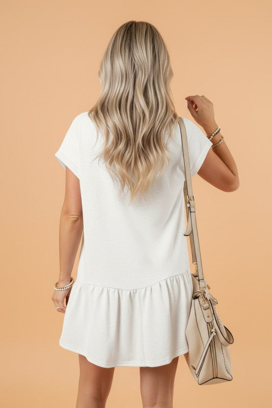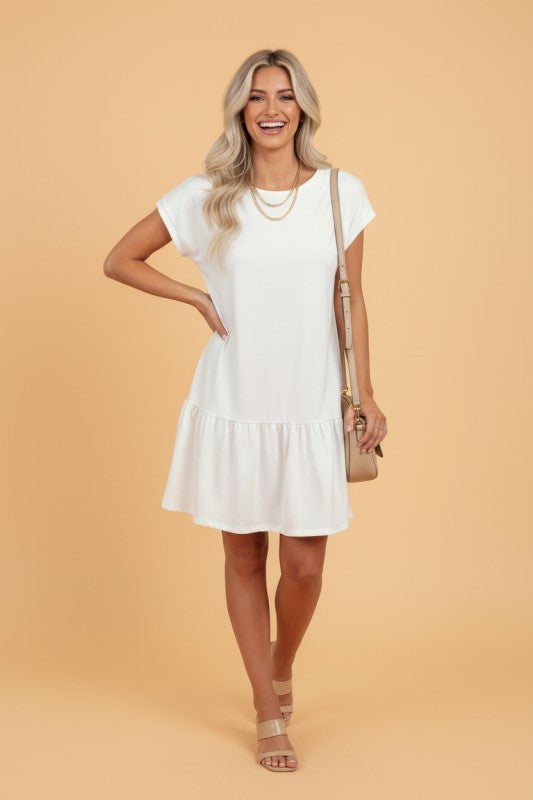Effortlessly chic and undeniably comfortable, this cap sleeve drop waist t-shirt dress combines casual style with flattering versatility. The crew neckline and ruffled hem add playful detail, while the stretch fabric hugs your curves just right, no matter your shape. Perfect for running errands, weekend outings, or laid-back days when you want to look put-together without trying too hard. Simple, cute, and ready for anything.
