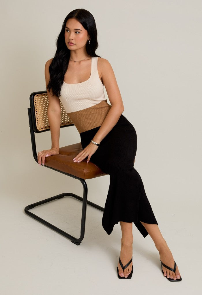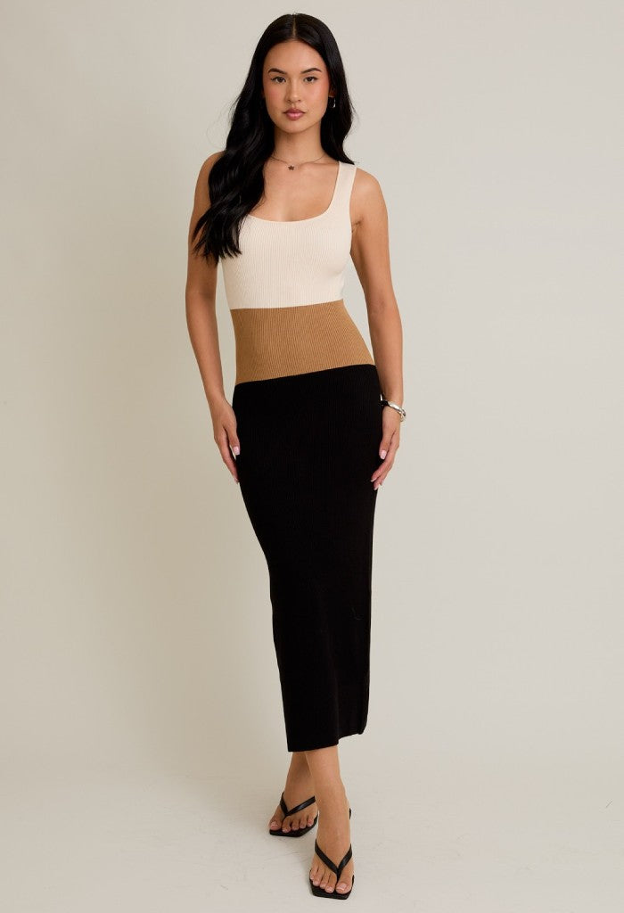 Effortlessly chic, the Trifle Midi Dress will instantly elevate your wardrobe. Sleek and sophisticated with a color-blocked design, it's perfect to wear with sandals or transition for fall with a luxe leather jacket and boots.