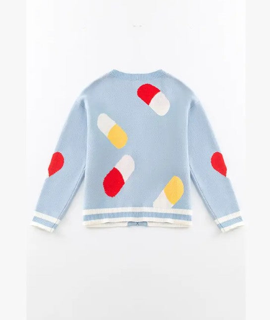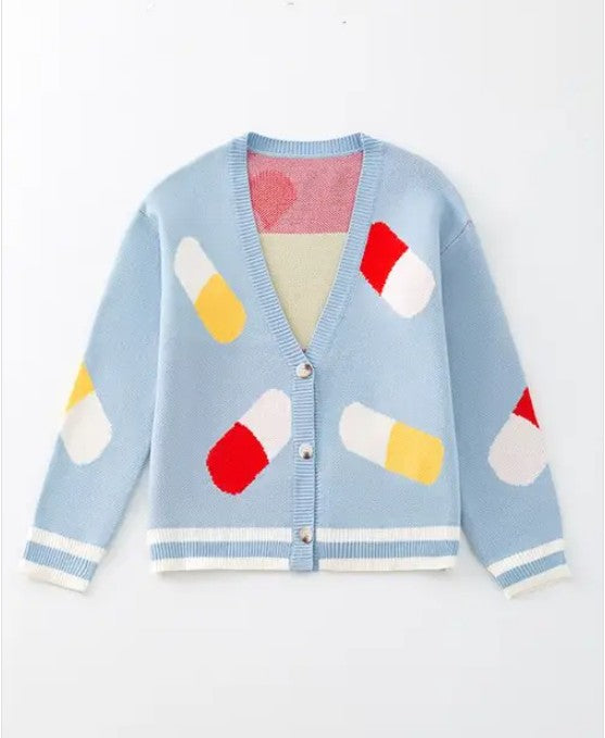 Featuring an eye-catching and playful pill capsule print, this cardigan adds a unique, fun touch to any outfit.Crafted from soft, breathable materials, this cardigan offers both comfort and style for everyday wear.