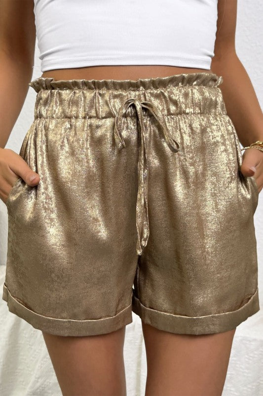 Flip into luxury with these show-stopping metallic shorts! Crafted from premium opulent fabric in a lustrous gold finish, they feature a playful frilled waistline and perfectly cuffed hem for that polished edge. The drawstring elastic waist ensures comfort while you move, making them ideal for everything from casual outings to elevated evening looks. Pair with a crisp tee for effortless sophistication, or dress them up for your next celebration. These aren't just shorts, they're your ticket to turning heads.
