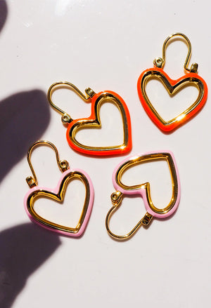 • Pair of baby pink enamel heart-shaped earrings with a U-shaped earring bar.