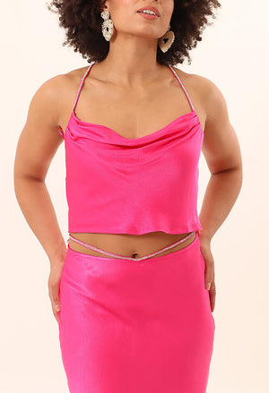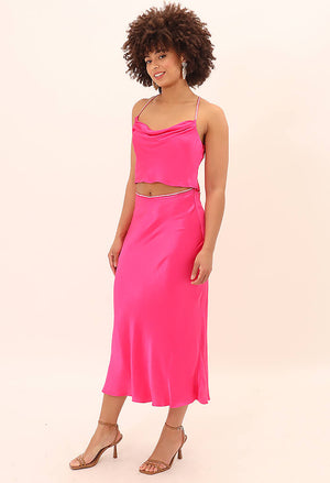 Flattering maxi skirt Rhinestone detail Side zip-closure Hot Pink Satin