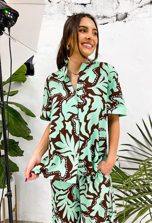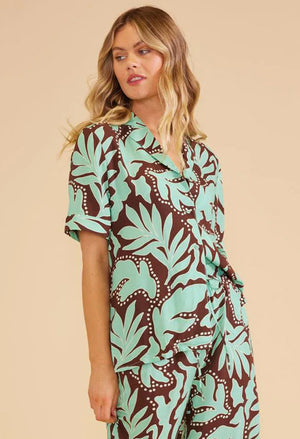 The Kelani Shirt is a relaxed resort style featuring an exclusive bold leaf silhouette print. Pair with the Kelani Pants for a matching look while relaxing poolside or at the beach.